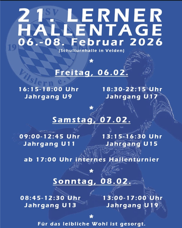 Am kommenden Wochenende heißt es wieder: Hallenfußball, Leidenschaft und echtes Vereinsleben! Die 21. Lerner Hallentage verwandeln die Veldener Schulturnhalle drei Tage lang in einen Treffpunkt für Fußballbegeisterte jeden Alters. Die Jugendabteilung des TSV Vilslern freut sich darauf, Spieler, Familien, Fans und Freunde des Vereins zu einem ganz besonderen Turnierwochenende begrüßen zu dürfen.